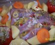 Legumele se curata, se spala si se taie bucati mari. Rosiile se aseaza in cate un colt al vasului, iar legumele pe langa bucata de carne. Se stropeste cu uleiul, se acopera cu folie si se da la cuptorul preincalzit pt aproximativ 20 minute. Se ia jos folia si se mai da la cuptor pentru inca 15-20 minute, pana se rumeneste frumos iar legumele sunt bine facute.