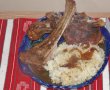 Se serveste friptura de miel cu cus-cus, fiert simplu in apa cu sare conform instructiunilor de pe ambalaj, iar deasupra se pune din sosul care s-a format in tava cu friptura.