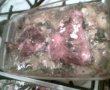 Se curata si se spala pulpele.Se curata catofii,se taie in patru.intr-un vas de yena se pune ulei ,se aseaza cartofii se presara vegeta,piper ,cimbru si busuioc si putina boia de ardei ,se aseaza peste cartofi cozile de ceapa verde taiate si apoi carnea .Carnea se condimenteaza cu condimentul pentru pui si cu putin busuioc.Se adauga apa si se da la cuptor .Usturoiul se piseaza si se freaca cu putina sare si ulei apoi se adauga apa de la friptura .Cand carnea este patrunsa se pune mujdeiul si se mai da 5-10 min la cuptor.