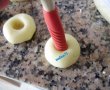 Se formeaza bilute rotunde si cu dosul lingurii de lemn se face o gaura in mijloc unde se pune gemul de caise sau capsuni. Se pun intr-o tava unsa sau tapetata cu hartie si apoi se pun la cuptor se coc 15 minute.Se scot se pudreaza cu zahar praf,iar apoi cu o pensula umeda se sterge zaharul pudra pe de gem pt a arata mai bine,in schimb la mine nu a mai fost cazul
