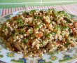 Între timp se fierbe cus-cusul în apă cu sare, conform recomandărilor de pe ambalaj. Când este gata, se strecoară, se clătește și se lasă în strecurătoare, ca să se scurgă de apă.