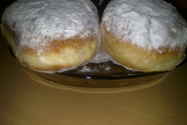 Dupa ce a dospit intindem o foaie de 1,5 cm grosime. Cu o forma rotunda taiem gogosi si le mai lasam 20 minute la dospit. Incingem uleiul si punem gogosile la prajit pe ambele parti. Dupa ce s-au prajit punem pe o hartie absorbanta, sa se scurga de ulei. Pudram cu zahar pudra amestecat cu zahar vanilat.