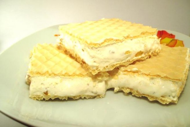 Intr-o tava de 32x42 punem 1 foaie de napolitana peste care turnam compozitia si deasupra punem a doua foaie de napolitana.Lasam putin sa se raceasca si apoi dam tava la frigider.