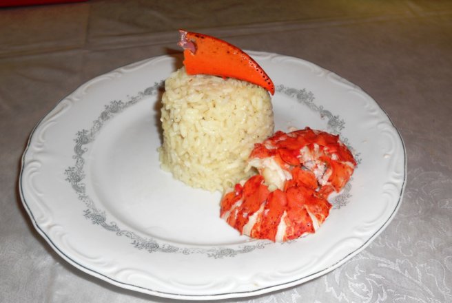 Calim carnea de homar in unt si o amestecam cu orezul condimentat dupa gust cu sare si piper. Cine doreste poate sa serveasca carnea de homar linga orez nu este obligatoriu sa o amestecam cu orezul.