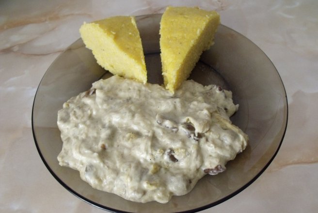 Se toaca ceapa si se pune la calit in uleiul incins . Se adauga hribii fierti peste ceapa calita si se lasa 10 minute pe foc amestecand continuu. Batem ouale cu smantana si o lingura de faina, adaugam sare si piper ( dupa gustul fiecaruia ) dupa care turnam amestecul peste hribi. Lasam pe foc pentru inca 10-12 minute. Pisam usturoiul si-l adaugam la sfarsit. Optional se poate adauga si patrunjel verde tocat.