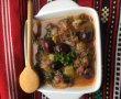 Apoi se asezoneaza de sare si piper, se adauga maslinele, bulionul, vinul si usturoiul, lasandu-se la gatit, semiacoperit cca. 15 minute la foc mediu.