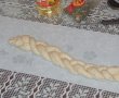 Impartim aluatul in 3 parti egale, iar fiecare parte o impartim tot in trei din care facem suluri pe care le impletim si le tapetam cu mac si seminte de dovleac, dupa care le asezam in tava si le mai lasam sa creasca in tava cat se incinge cuptorul.