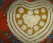 Am rupt marginile prajiturii si le-am asezat in tava in forma de inima. Am impartit sosul alb peste acestea.