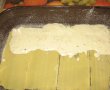 Continuam pina se termina toate tot asa: lasagne, cascaval, sos Bechamel, sos Bolognese, lasagne...Deasupra va fi un strat de lasagne peste care rasturnam sosul Bechamel ramas, cascaval ras si bucatele de unt.