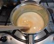 Separat batem ouale intregi cu un tel si luam de pe foc sosul . Turnam ouale foarte incet treptat , amestecand foarte bine sosul, sa se omogenizeze .Dam din nou la foc mic fara a ne opri din amestecat, pana se ingroasa sosul.
