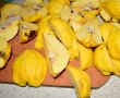 Alegem gutuile cele mai coapte pentru a se macera mai rapid. Le spalam bine cu buretele de bucatarie, cu partea abraziva pentru a le indeparta tot puful. Apoi taiem gutuile in sferturi, le indepartam cotoarele si le tocam in cuburi.