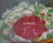 Se adauga mazarea si galustele la mancare, se condimenteaza cu sare si piper, iar dupa ce fierbe cateva minute se pune si sosul de rosii. Se lasa sa mai dea cateva clocote si apoi e gata.