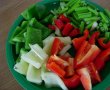 Spalam si curatam ardeii de seminte si cotoare, apoi ii taiem in cuburi cam de 2cm. La fel portionam si pieptul de pui. Ceapa spalata , o feliem. Morcovul si telina, dupa ce le-am curatat si spalat, le taiem in forma de betisoare subtiri.