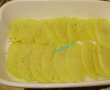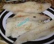 Se unge bine un vas cu ulei apoi se pun feliute de cartofi suprapuse una peste alta putin,apoi se pun zarzavaturile calite dupa care se pun bucatile de peste ,patrunjel verde si usturoi, apoi din nou un strat de cartofi taiati feliute si se stopeste cu putin ulei de masline si putina boia de ardei dulce