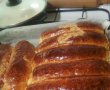 Dupa ce a crescut aluatul, il framantam pana se omogenizeaza, il impartim in 12 bile pe care le intindem in 12 foi. Pe fiecare foaie, adaugam compozitia 6 cu mac si 6 cu nuca, se ruleaza si se ung cu galbenus de ou. Se da la cuptor circa 40 de minute, se verifica cu o scobitoare daca este copt.