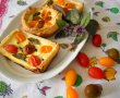 Formele mici de tarte le capitonam cu foietaj,in interior punem bucatele de ton bine scurs,masline taiate fin,parmezan ras,impartim cu lingura amestecul de iaurt,oua si putin piper,deasupra felii de rosii,cate o frunza de busuioc si lasam la cuptor 30min