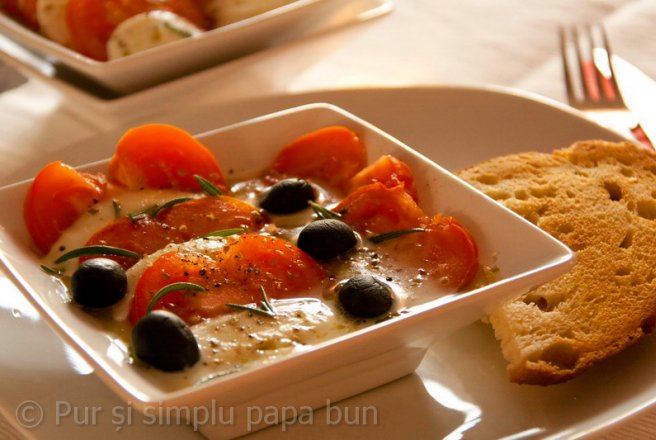 Bucata de mozzarella și roșiile se feliază, se așează în două boluri alternând feliile de mozzarella și roșii, apoi se sarează si se piperează, se presară oregano uscat și se stopește cu ulei de măsline.