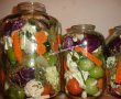Legumele trebuie sa fie frumoase si nepatate cele atinse inlaturandu-se. Pe fundul borcanului se pun cele care arata mai bine si deasupra cele mai coapte pentru a se consuma primele. Eu folosesc gogonele potrivite ca sa se patrunda mai bine si varza rosie mai multa sa le dea culoare frumoasa. Legumele se curata si se spala. Conopida se desface buchetele si se pune in apa cu sare. Verzelor li se taie cotorul in cruce si se taie apoi in sferturi. Morcovii si telina se taie in fome dorite rondele sau pe lung. Hreanul se taie in patru pe lung. Conopida se scurge de apa in care a stat si se spala frunzele de telina. Borcanele se spala bine si se clatesc cu apa clocotita. Se aseaza pe fundul borcanului cateva bucati de hrean apoi asezam frumos legumele asortate dupa imaginatia fiecaruia. Hreanul si varza rosie trebuie sa ne ajunga sa punem atat pe fund, la mijloc cat si deasupra lor. Se pun printe ele boabe de mustar, piper, frunze de telina, catei de usturoi, marar uscat rupt bucati, foi de dafin si cimbru. Cand s-a umplut borcanul se pune deasupra hrean, crengi de marar mai groase si peste el niste tije curate de lemn eventual oparite pentru a impiedica ridicare legumelor deasupra lichidului. Se pune 1 lingura cu varf de sare mare la 1 litru de apa. Se pun cativa litri de apa cu sarea masurata, se adauda boabe de mustar, piper, frunze de telina, marar uscat rupt bucati, foi de dafin si cimbru si se pune pe foc sa dea in clocot 10-15 minute.