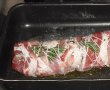 Acoperim bucata de muschi cu baconul si o legam cu ata ca sa nu se desfaca si punem si ramurelele de rozmarin cand legam.Condimentam si punem in tava unde il vom face impreuna cu untul sa se rumeneasca pe toate partile apoi stingem cu vinul,punem si apa,sare si piper daca mai e nevoie si dam la cuptorul incins la 170-180° pana se rumeneste frumos(eu l-am lasat cam 1 ora si jumatate).