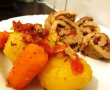 Intindem acest amestec peste bucata de carne apoi rulam.Asezam rulada intr-un vas termorezistent in care am pus putina apa si introducem la cuptor la foc mediu.Dupa 30 minute adaugam morcovii taiati bucati mai mari si cartofii intregi.Daca este nevoie mai adaugam putina apa.