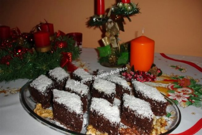Punem untul, zaharul, laptele si cacao intr-o cratita si fierbem la foc potrivit 10min. Din aceasta compozitie oprim 16 linguri in care adaugam 100g ciocolata amaruie. Omogenizam bine pana se topeste ciocolata. Restul compozitiei ramase o lasam la racit. Cand este complet rece adaugam cele 4 galbenusuri pe rand si amestecam dupa fiecare, praful de copt dizolvat in zeama de lamaie si faina treptat. Separat batem spuma albusurile cu un praf de sare si le adaugam in compozitia de galbenusuri amestecand usor de jos in sus. Se adauga nucile si stafidele care au fost inmuiate in rom. Tapetam o tava cu hartie de copt si turnam compozitia. Dam 30-35 min la cuptorul incalzit la foc potrivit. Dupa ce scoatem prajitura , intindem bine glazura oprita si lasam sa se raceasca bine inainte de a o taia. Eu am ornat-o cu fulgi de cocos.