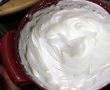 Albusurile le batem spuma cu un praf de sare. Cand se intareste spuma de albusuri, adaugam cate o lingura zahar si mixam bine, bine, cam 20 minute in total.