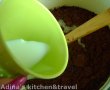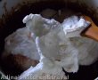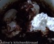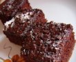 Restul se amesteca ,cu mixerul la viteza mica,cu albusurile batute tare,ca la bezea.Se adauga apoi galbenusurile,faina in ploaie,vanilia,esenta de rom si praful de copt stins in putin otet.Este bine ca in momentul in care adaugam faina sa dam la o parte mixerul si sa folosim o paleta cu care sa amestecam prin rasturnare,usor. Se toarna intreaga compozitie intr-o tava tapetata cu hartie de copt si se coace la cuptor cca.40 de minute la foc mediu. Dupa ce s-a racit putin blatul se intinde restul de sos,cel oprit,si se presara imediat fulgii de ciocolata sau nuca de cocos rasa. Se formeaza o crusta delicioasa.