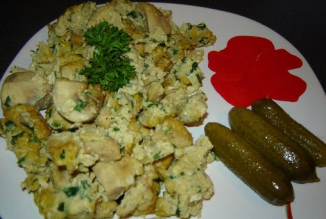 Se taie pieptul de pui cubulete si se pune la prajit. Se adauga condimentele si se amesteca bine. Se adauga ceapa tocata marunt, apoi ciupercile taiate in patru. Se lasa acoperit vreo 5 minute dupa care se adauga ouale, patrunjelul tocat si se amesteca. Eu am turnat compozitia in forma de tarta si am dat-o la cuptor 10 minute sa se faca bine ouale, ca nu imi plac sa fie moi.
