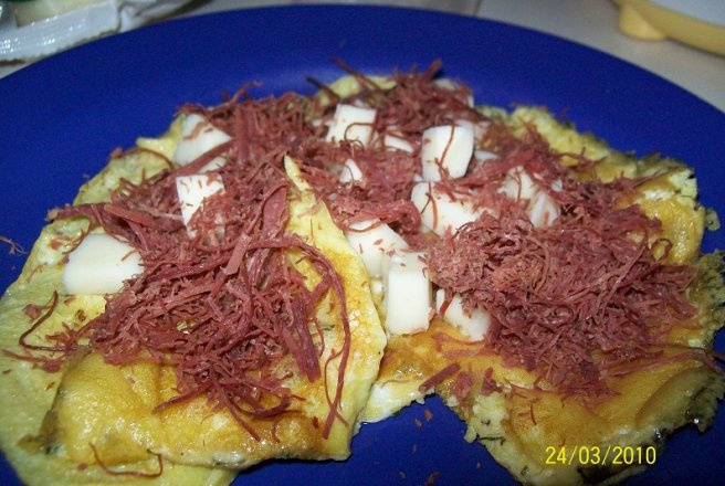 Batem cele 3 oua, adaugam sare, marar si punem totul in tigaie pana se face. Dupa prajire asezam pe farfurie si punem mozzarela si sfilaci de cal (aceasta carne fasii o am din Italia se adauga peste pizza, oua, aici nu stiu daca se gaseste acest preparat).