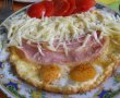 Pentru aceasta Omletă haioasă cu ochișori – Rețetă rapidă pe placul copiilor, sunt necesare urmatoarele ingrediente: oua, sunca, cascaval, rosie.