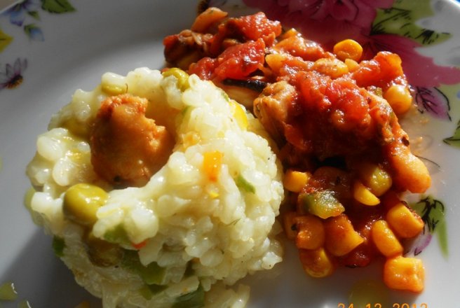 Se adauga jumatate din ardei, mazarea, morcovul si jumatate din cantitatea de porumb. Se lasa cateva minute la calit. Se dau deoparte si se amesteca cu orezul fiert. Adaugam si untul si amestecam.
