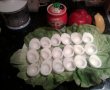 Se fierb ouale tari si se curata de coaja,se taie in doua si se scot galbenusurile.Se face o maioneza dintr-un galbenus crud si 2-3 galbenuse fierte,cu ulei,condimentata cu sare si piper dupa gust si putina zeama de lamaie.Se lasa cateva linguri de maioneza,restul se amesteca cu ciupercile,sunca,ardeiul si castravetele(bine scurse de zeama)Jumatatile de ou se pun pe un platou si se umplu cu compozitia de mai sus.Maioneza ramasa se amesteca cu iaurtl si se subtiaza cu lapte,se orneaza cu ea ouale.Se decoreaza cu ardei gras si patrunjel