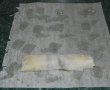 Se pun 3 linguri de amestec in margine, se ruleaza jumatate, se indoaie marginile si se ruleaza pana la capat.