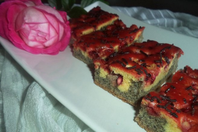 Partea cealalta de compozitie se repartizeaza uniform peste compozitia din tava iar deasupra presaram semintele de rodie.