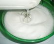 Preparam pandispanul: dupa separarea oualelor, batem albusurile cu 40 ml apa calda, adaugam zaharul treptat si se bate bine astfel incat daca intoarcem bolul, albusul sa nu cada.