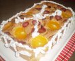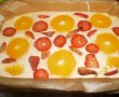 Faina se amesteca cu praful de copt si sarea, se amesteca cu albusurile si galbenusurile. Se amesteca usor , compozitia obtinuta se pune la copt intr-o tava tapetata cu hartie de copt. Deasupra se pun felii de capsuni,portocale si prune.