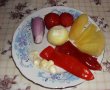 Spalam, curatam si portionam pasarea. Spalam si curatam legumele (am folosit legume de la congelator, erau spalate si curatate). Tocam ceapa galbena, taiem rondele ceapa rosie si le calim in 200 ml ulei. Dupa cateva minute adaugam ardeii grasi si ardeiul kapia sau gogosarul maruntit. Calim totul timp de 5 minute. Adaugam rosiile feliate, carnea si presaram boiaua dulce si picanta. Completam cu apa pana cand acopera usor paprikasul. Saram si piperam dupa gust. In ultimele minute de fierbere adaugam usturoi rondele, ardei iute si patrunjel verde tocat marunt.