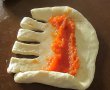 Punem pe mijloc , cu o lingura, din compozitia de dovleac, acoperim prima oara cu partea netaiata de aluat , apoi cu fasiile taiate ( vezi foto) .