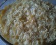 Intre timp intr-un castron mai mare radem branza pe razatoarea mare, adaugam 3 oua si smantana si amestecam bine toate ingredientele, adaugam si pastele scurse si racite. Amestecam usor si pastele in compozitia de branza cu samantana.