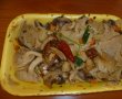 Pastele se scurg cu o paleta din apa si se pun direct in farfurie, se razuieste deasupra parmezan, apoi se pun ciupercile deasupra. Se mai arunca niste patrunjel verde si gata sunt de papat.