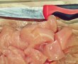 Ceapa și dovleceii se curăță de coajă. Ceapa se taie mărunt și se pune la călit în ulei cu puțină apă. Dovlecelul curățat se rade pe răzătoarea mare și se adaugă la ceapă, lăsându-se la gătit cca. 10 min. la foc mic, apoi se adaugă pieptul de pui tăiat cubulețe, și se gătește în continuare, la foc micneacoperit cca. 10 minute. Se asezonează de sare și piper proaspăt și se lasă deoparte.