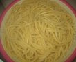 Punem pastele la fiert in apa cu sare.Dupa ce s-au fiert le punem intr-o stercuratoare si le clatim cu apa rece.