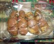 Cand au trecut cele 12 ore se ia carnea ,se face sul ,se leaga cu ata si se pune in tava pe hartie de copt,se acopera cu folie de aluminiu si se da la cuptorul preincalzit circa 50 de min.Dupa 30 de min se ia folia jos si se mai stropeste cu sos si se mai lasa 20 de min sa se rumeneasca stropindu se cu sos din cand in cand .Eu le am pus in punga de copt si apoi am taiat punga pentru ultimele 20 de min.