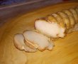 Dupa ce a stat la marinat, scoatem bucatile de piept, le legam strans cu ata de bucatarie si le asezam in tava pe hartie de copt.