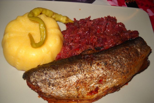 In vasul ce urmeaza sa-l punem la cuptor, inabusim ceapa si ardeiul taiate marunt in unt si putina apa, adaugam rosiile apoi cele doua verze taiate fideluta si frecate cu sarea de lamaie; amestecam totul bine, adaugam si 1 pahar cu apa apoi lasam la foc mic cu capac 30 min; dupa ce varza este fiarta, condimentam dupa gust cu sare, cimbru, piper, cumin, usturoi pisat, punem deasupra pestele si lasam la cuptor 30 min, dupa acest timp scoatem vasul, intoarcem pestele sa se rumeneasca 15 min dupa care se poate servi, cum altfel decat cu mamaliguta.