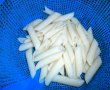 Pieptul de pui se taie cubulete, se spala, se da cu sare si se pune intr-o tigaie in untura incinsa, acoperind-o cu un capac. Dupa ce se prajeste carnea putin, se adauga 100 ml apa pentru a se patrunde mai bine.