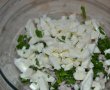Se fierb cartofii in prealabil, incat sa fie ca un piure, se fierb cu coaja dupa care se curata si se paseaza. Adaugam ceapa tocata marunt, mozzarella, muschiul se taie cubulete, parmezanul se da prin razatoare, si verdeata tocata marunt. Se amesteca toate intr-un bol se adauga sare si piper. Adaugam 2 galbenusuri incat totul sa se lege. Albusurile vor fi folosite pentru prajire.