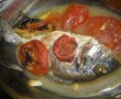 Pestele se curata,eviscereaza si se spala.Intr-un vas termorezistent se aseaza pestele,care se asezoneaza cu sare,piper cimbru,rozmarin(cimbru si rozmarinul dupa gust).Jumatatea de lamaie taiata felii se pune printre peste.Deasupra se pun feliile de rosii(taiate rondele),usturoiul,uleiul si apa.
