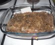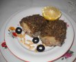 Pe un tocator se pun maslinele, usturoiul si semintele de pin. Se toaca bine cu un cutit, se pun intr-un castron, se adauga pesmetul, 4 linguri cu ulei, sare si piper dupa gust. Jumatate din cantitatea obtinuta se pune intr-un vas termorezistent, deasupra pestele condimentat cu arome speciale (eu am piper cu lamaie), se toarna vinul, se acopera cu restul compozitiei, restul de ulei si se da la cuptor 15-20 minute. Se serveste cu felii de lamaie.