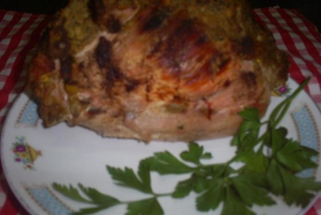 Se umple cu umplutura de mai sus,se codimenteaza cu sare si piper si se da la cuptor cu un pic de ulei si apa.Se unge din cand in cand cu sosul din tava.Cand e frumos rumenit si furculita intra usor in piept,se scoate din cuptor. Daca se serveste ca aperitiv se lasa sa se raceasca apoi se feliaza.Daca se serveste ca fel principal,se feliaza cald.Se serveste cu garnitura de legume,orez sau sos de vin alb.